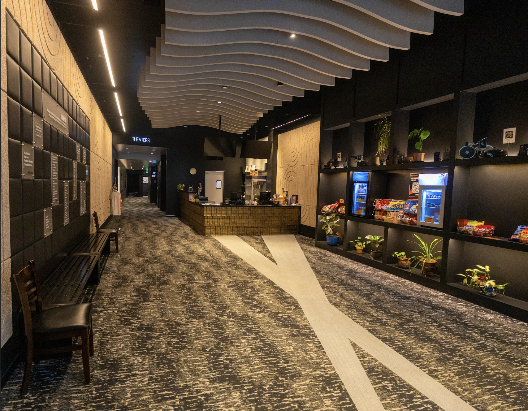 The lobby of the new Pickford on Grand St., which opened on Aug. 1, 2025. The location introduces three new theaters, two of them with 61 seats and one jewel-box theater with 20 seats. // Photo by Chayton Engelson