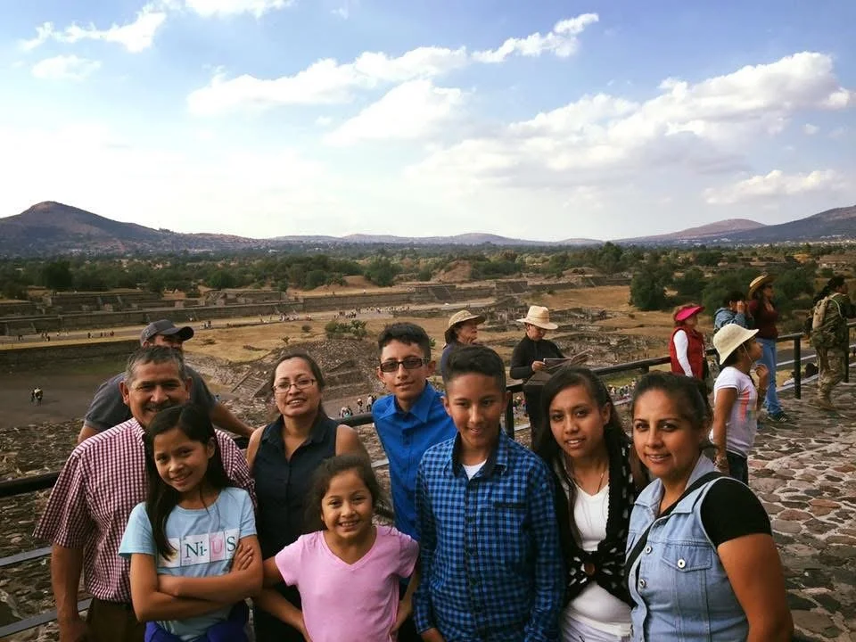 Julieta Larios (far left in the blue) with her family at the Teotihuacan ruins in Mexico.