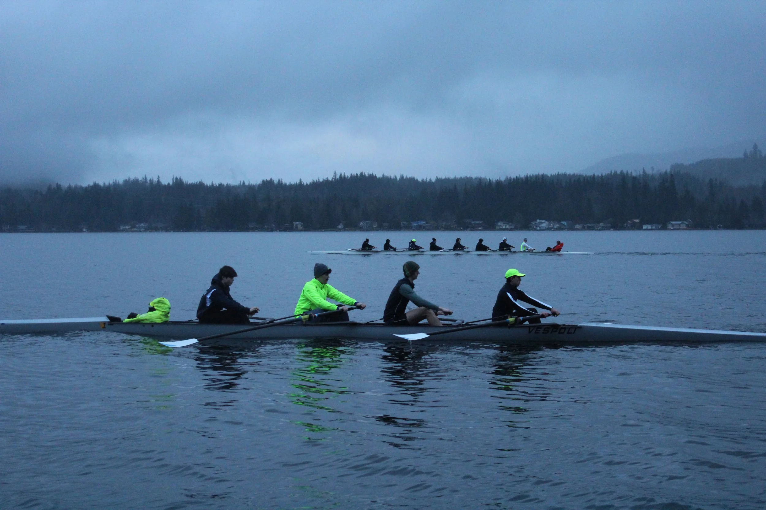 The varsity eight-person boat on the waters of Lake Whatcom early Saturday morning. Rowing is a demanding sport with practices from 5 a.m. to 7 a.m. on weekdays and 7 a.m. to 9 a.m. on Saturdays.