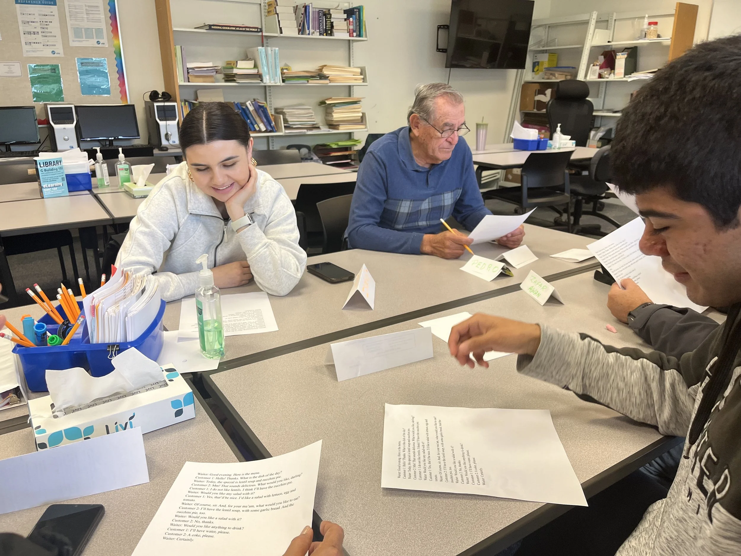 “Watch the way my mouth moves.” The instructor points to her lips and slowly sounds out a word as the class repeats it. Around the room, volunteers guide small groups of learners through English language exercises, helping students build sentences and practice pronunciation.