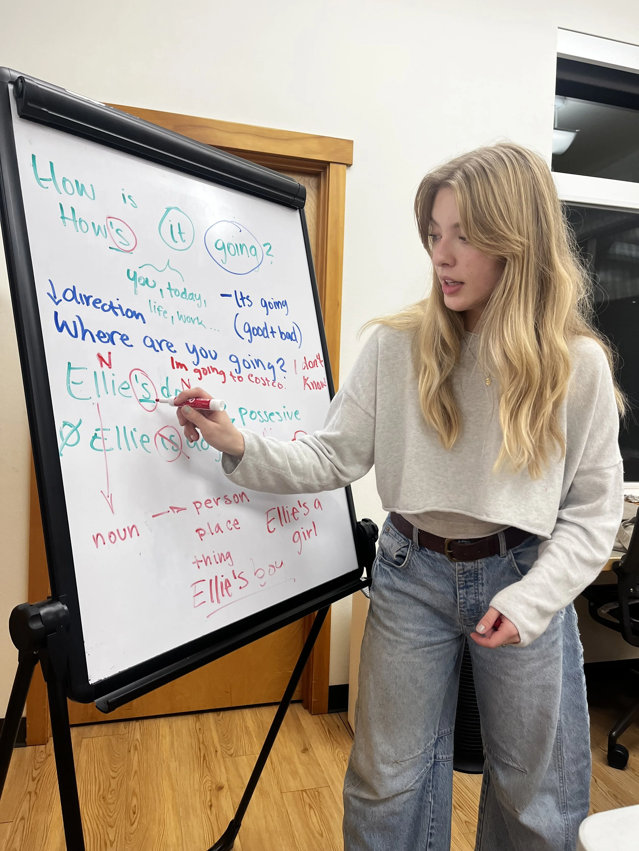 A volunteer tutor circles letters on a whiteboard as she guides a small-group class through learning contractions. // Photo courtesy of the Whatcom Literacy Council.