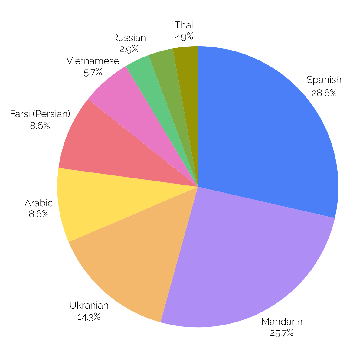 This graph shows the primary languages spoken by learners in the Whatcom Literacy Council’s English Language Learners program. The unlabeled section on the graph is Swahili, and represents 2.9% of learners in the ELL program. // Graph courtesy of the Whatcom Literacy Council.