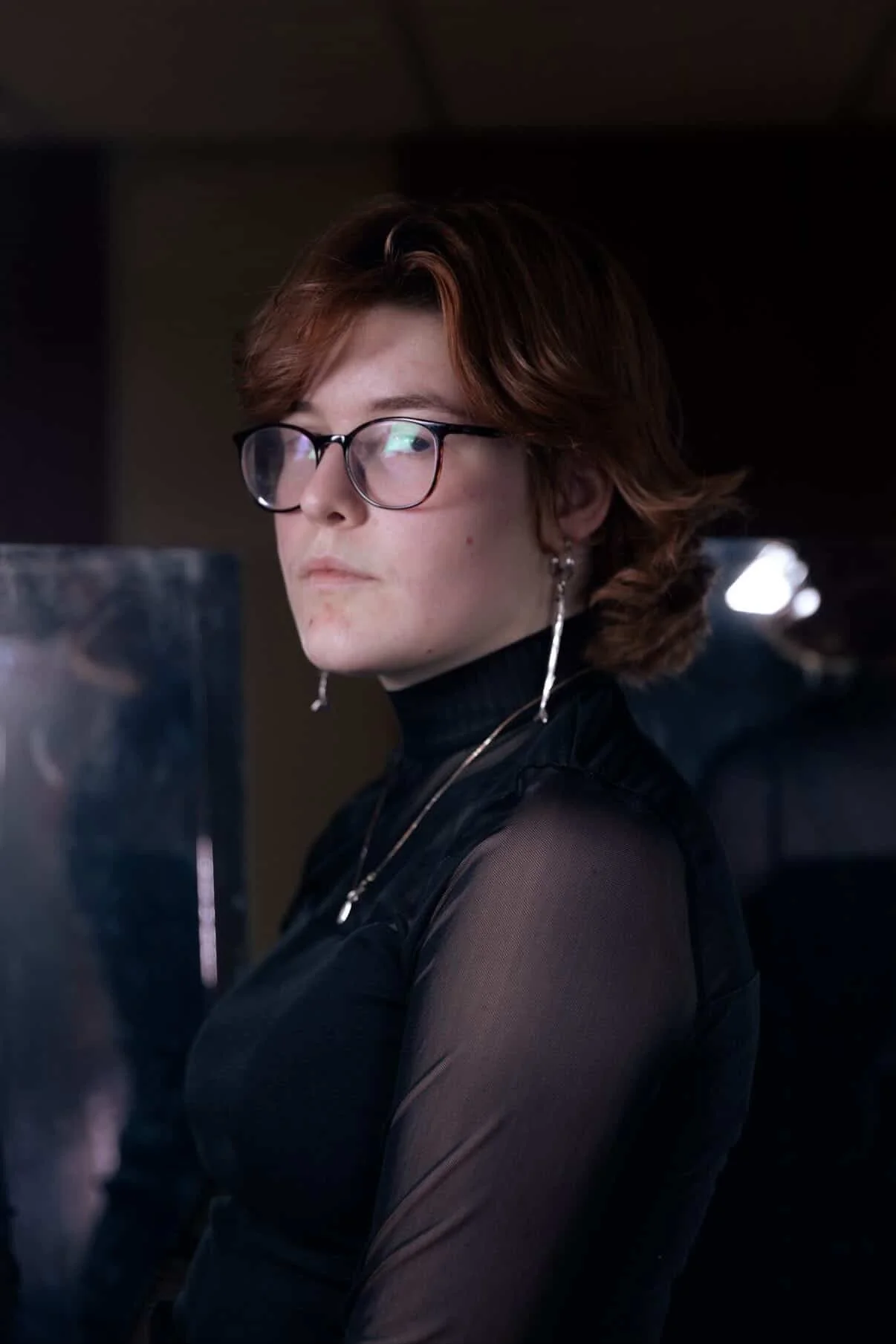 Nat Ballard, 20, looks over her shoulder, dressed in black with mesh sleeves, in the Viking Union. // Photo courtesy of Atlanta Moss.