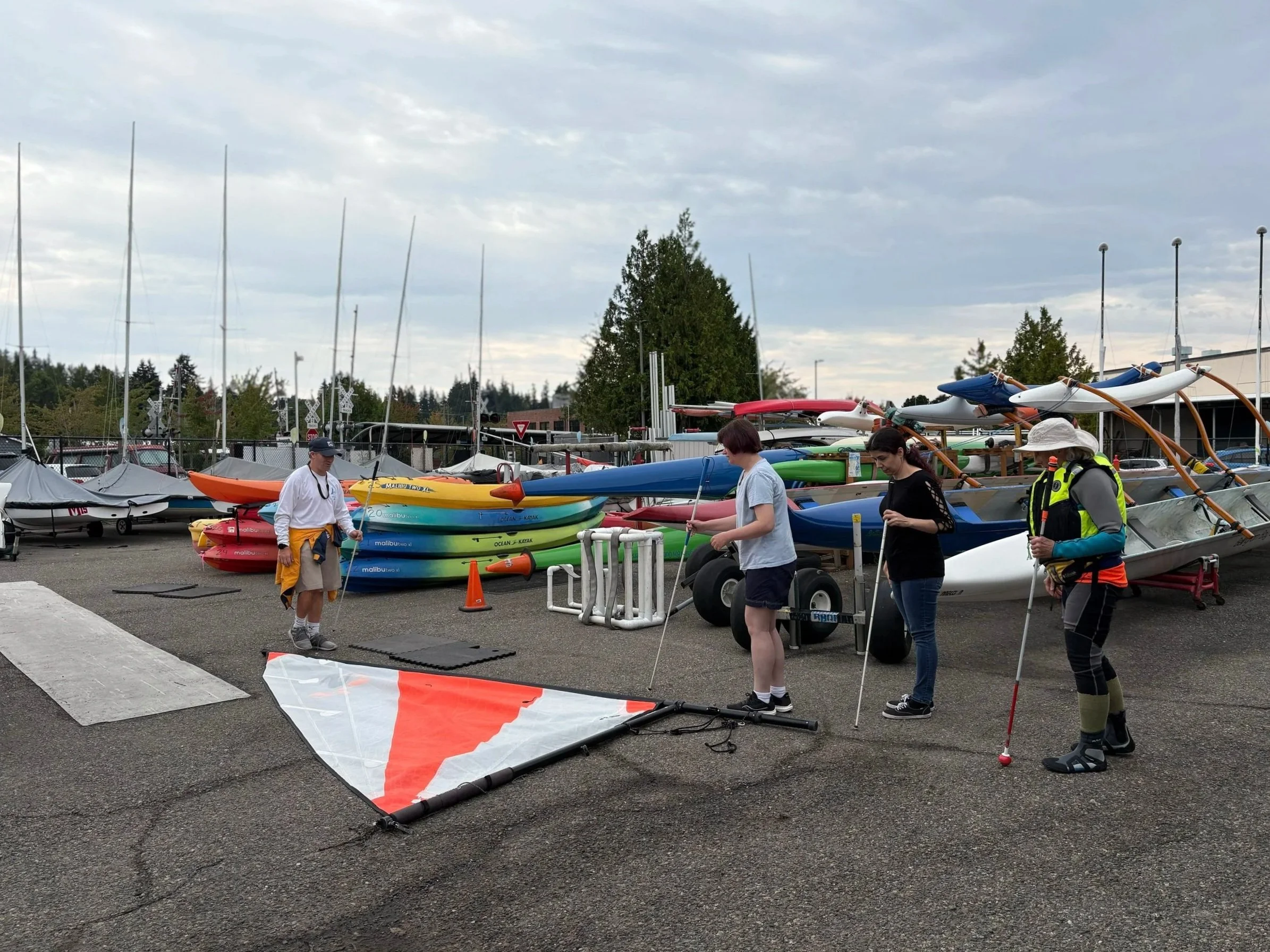 Members of the Blind Sailing Clinic gather around and inspect a hansa boat sail at the Community Boating Center in Bellingham, Wash. in summer 2025. These boats feature a high-stability, low center-of-gravity design, making them more accessible and tailorable to sailors with disabilities. // Photo by Bryan Rust, courtesy of the Community Boating Center