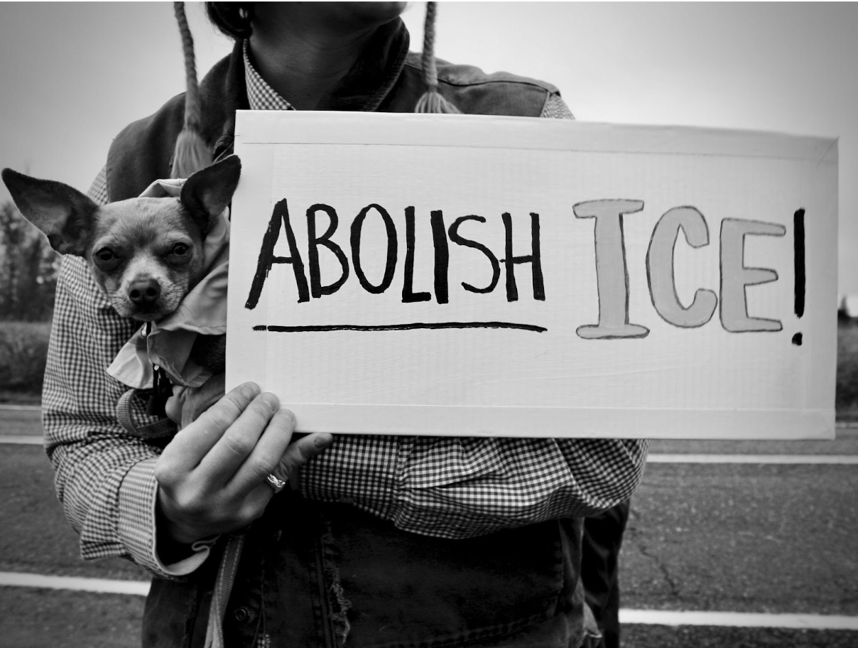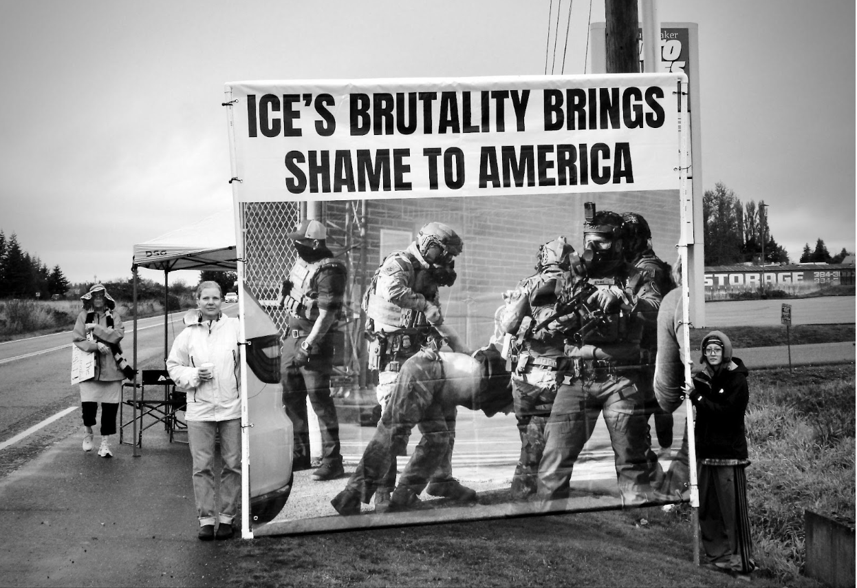 At 4 p.m. on a late-October Friday, the shoulder of the Ferndale highway felt raw in the way pavement gets when the cold settles. A sweet, older man with a windburned face stood alone trying to wrangle a 10-foot banner slapping against his legs. The image on it was of U.S. Immigration and Customs Enforcement officers forcing a man to the ground.