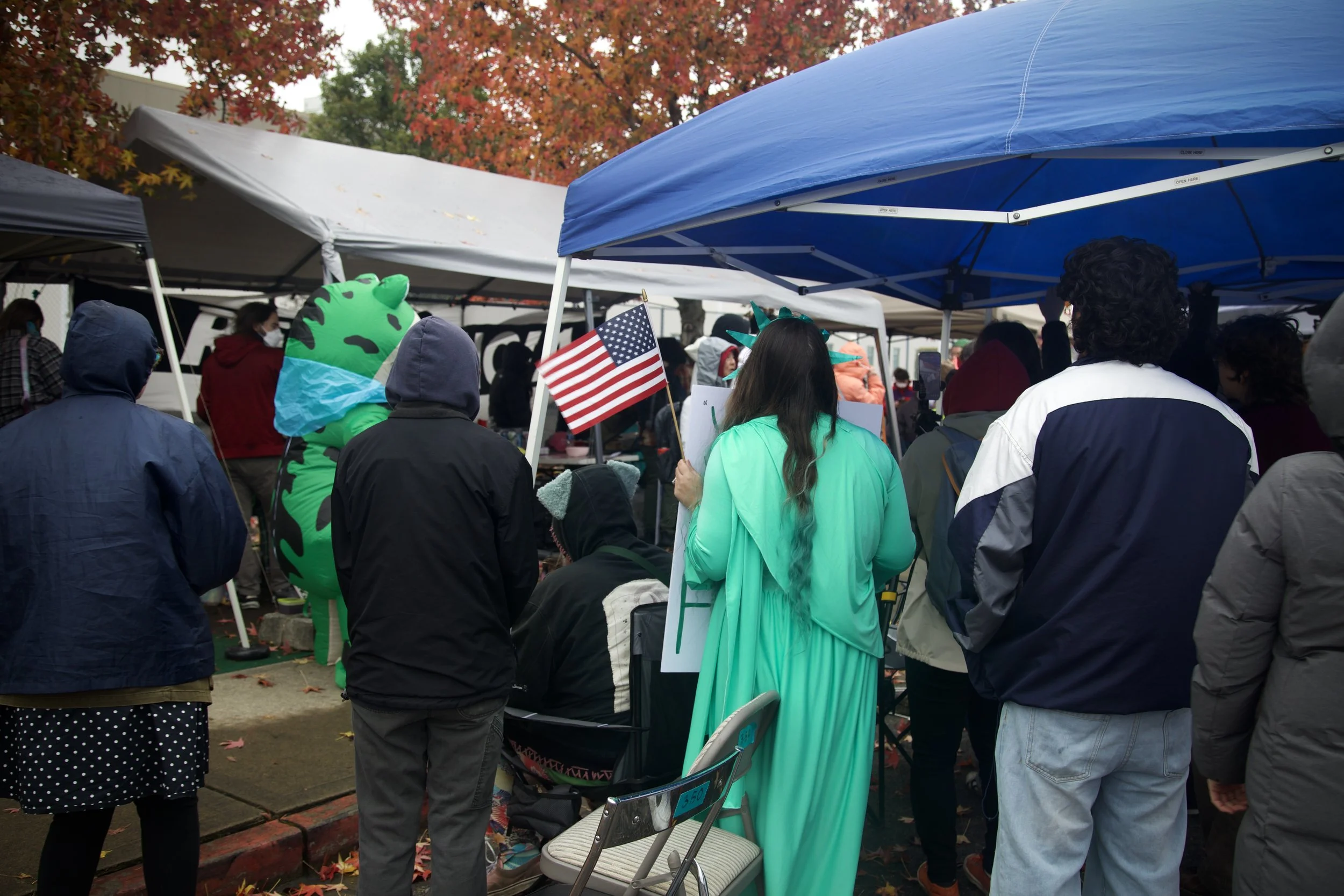 A growing crowd equipped with raincoats and knit hats shares laughter and tears as they wait. Protesters dressed as a frog and a Statue of Liberty watch a band of drummers hit bright orange buckets hung around their necks as they sing rallying songs.