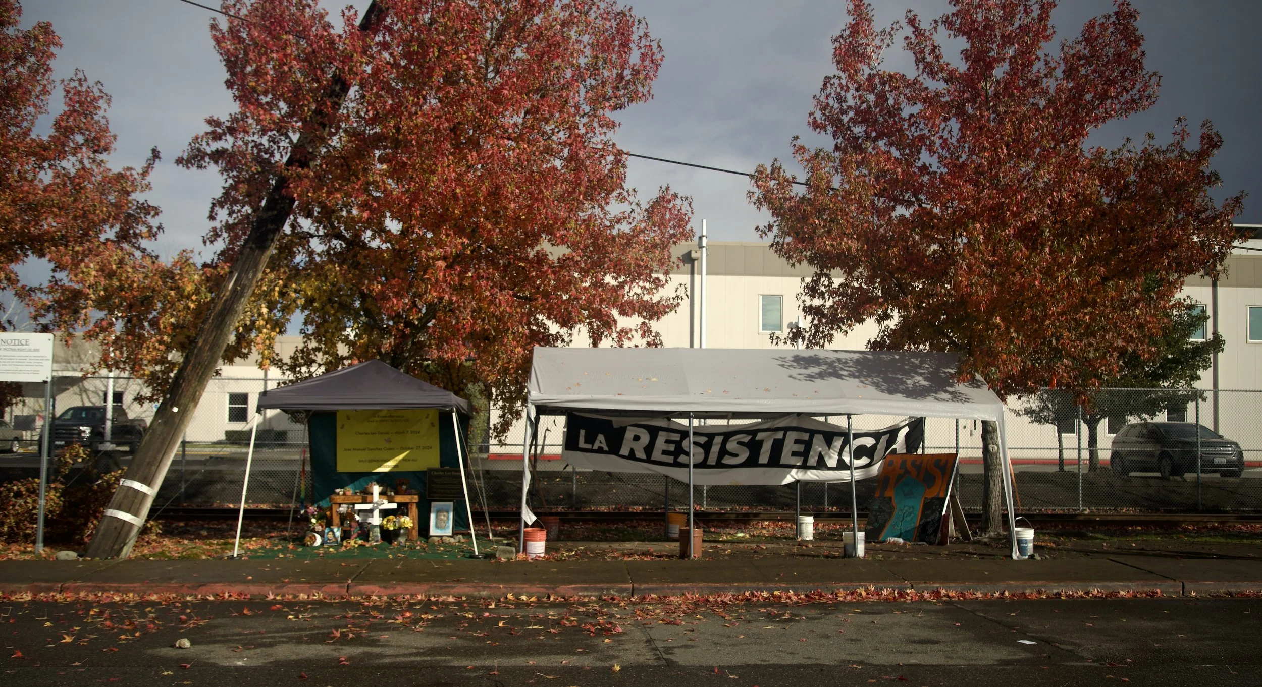 Next to La Resistencia’s tent stands an altar honoring the two detainees who died in the Northwest ICE Processing Center in 2024. Charles Leo Daniel died after being in solitary confinement for 1,244 days, and José Manuel Sánchez-Castro died five days after being sent to the NWIPC.