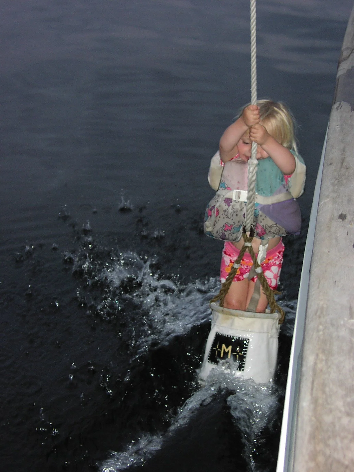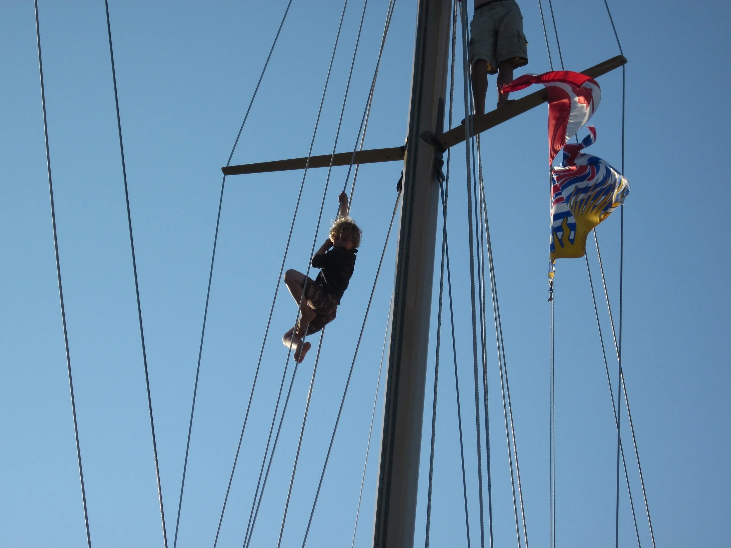 When I was 8 years old, I climbed into the rigging on the boat while in British Columbia. I was allowed to free climb (no harness), but I had to ask permission to climb above 10 feet. On this day, I was allowed to climb to 35 feet after proving I could safely climb to that height.